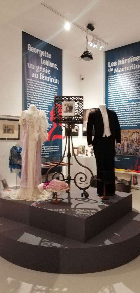 Georgette Leblanc, sa compagne et sa muse, est née à Rouen le 8 février 1869 et décédée au Cannet le 26 octobre 1941. Cantatrice et actrice de théâtre français, elle interprète le personnage de la Lumière de l’œuvre, l’Oiseau Bleu en 1911. Le voile qu’elle portait à cette occasion est précieusement conservé.