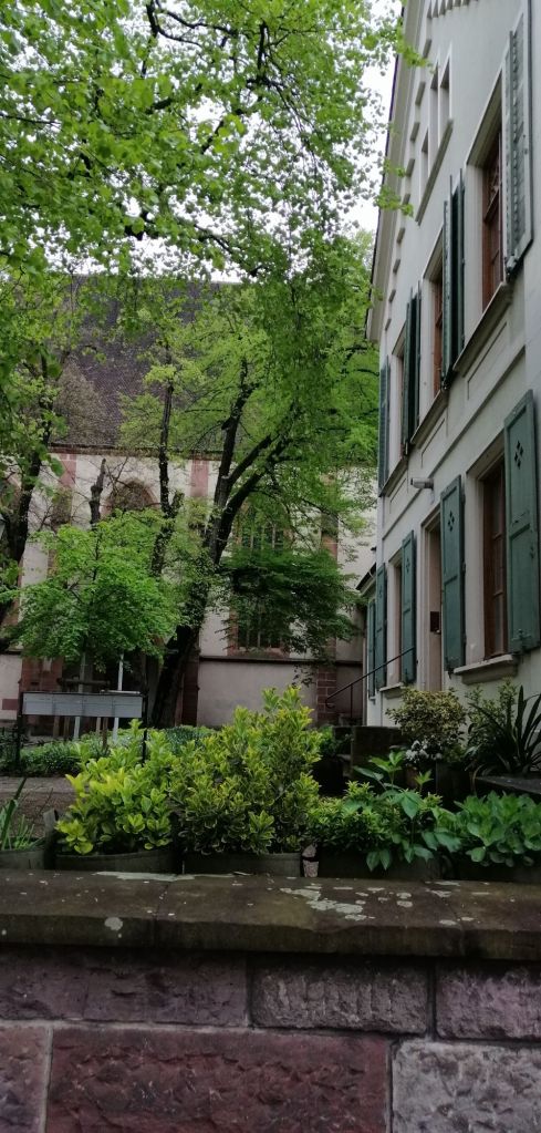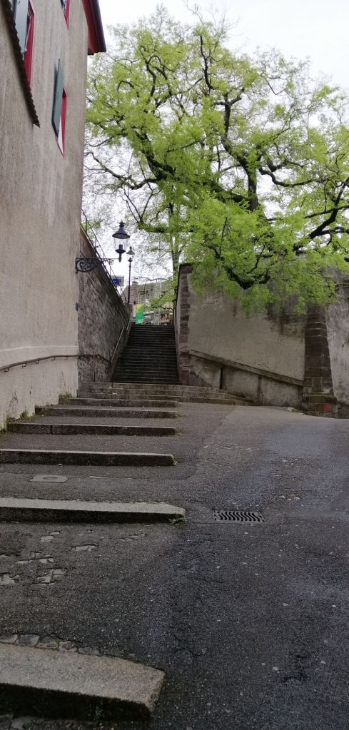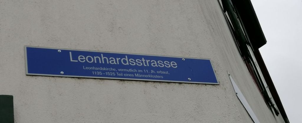 aux alentours de la rue, Leonhardstrasse et on apprend, Leonhardskirche, vermutlich im 11. Jh. erbaut, 1135-1525 Teil eines Männerklosters, Église Saint-Leonhard, probablement construite au 11e siècle, 1135-1525, faisant partie d’un monastère d’hommes.