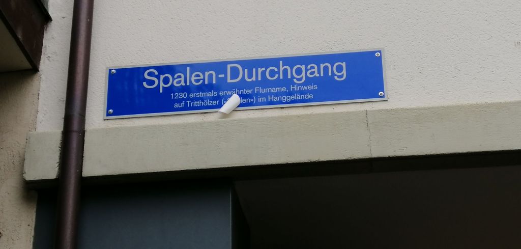Spalen-Durchgang, 1230 erstmal erwähnter Flurname, Hinweis auf Tritthölzer (« Spalen ») im Hanggelände, Spalen-Durchgang, nom de champ mentionné pour la première fois en 1230, référence aux pierres de gué (« Spalen ») dans le terrain à flanc de colline.