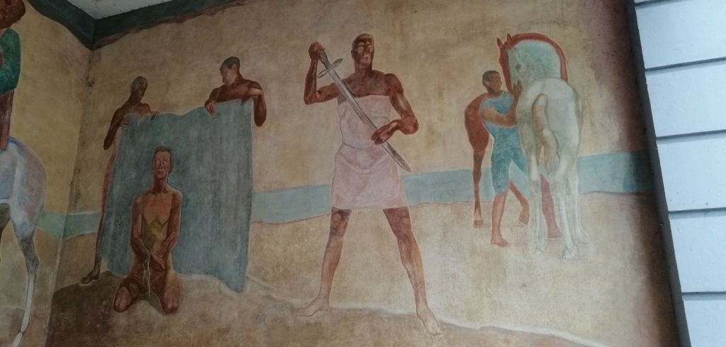 Ce panneau à proximité nous apprend une histoire supplémentaire sur la ville mais pas d’indication informative près de cette fresque décorant un point d’eau qui avait dû servir autrefois.