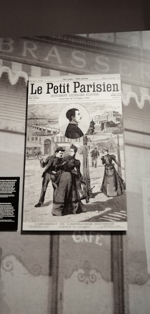 Cette exposition dévoile l’arme du crime. Comme c’est bouleversant de découvrir l’objet qui a causé la mort de la souveraine autrichienne. Au dessus, une page d’un journal montre un aperçu des sentiments du public, l’effroi, l’indignation, le choc.